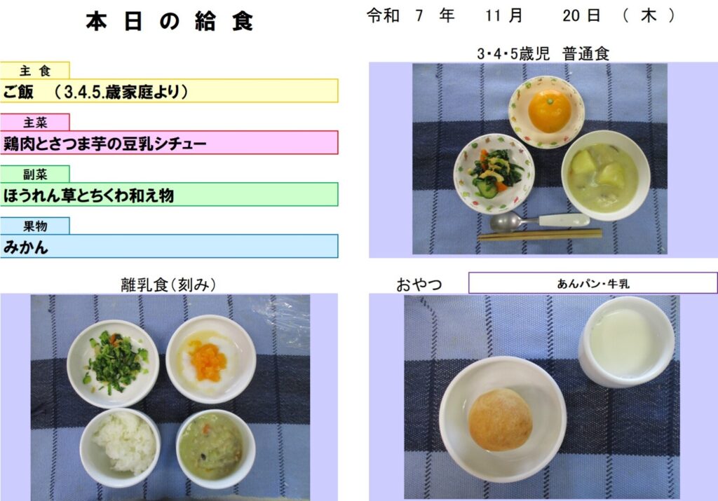 今日の給食(R7.11.20) - 玉名市岱明町 大野保育園