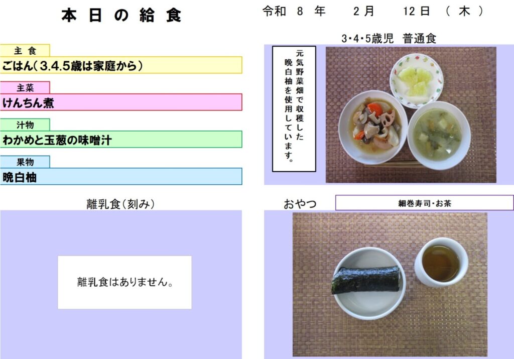 今日の給食(R8.2.12) - 玉名市岱明町 大野保育園