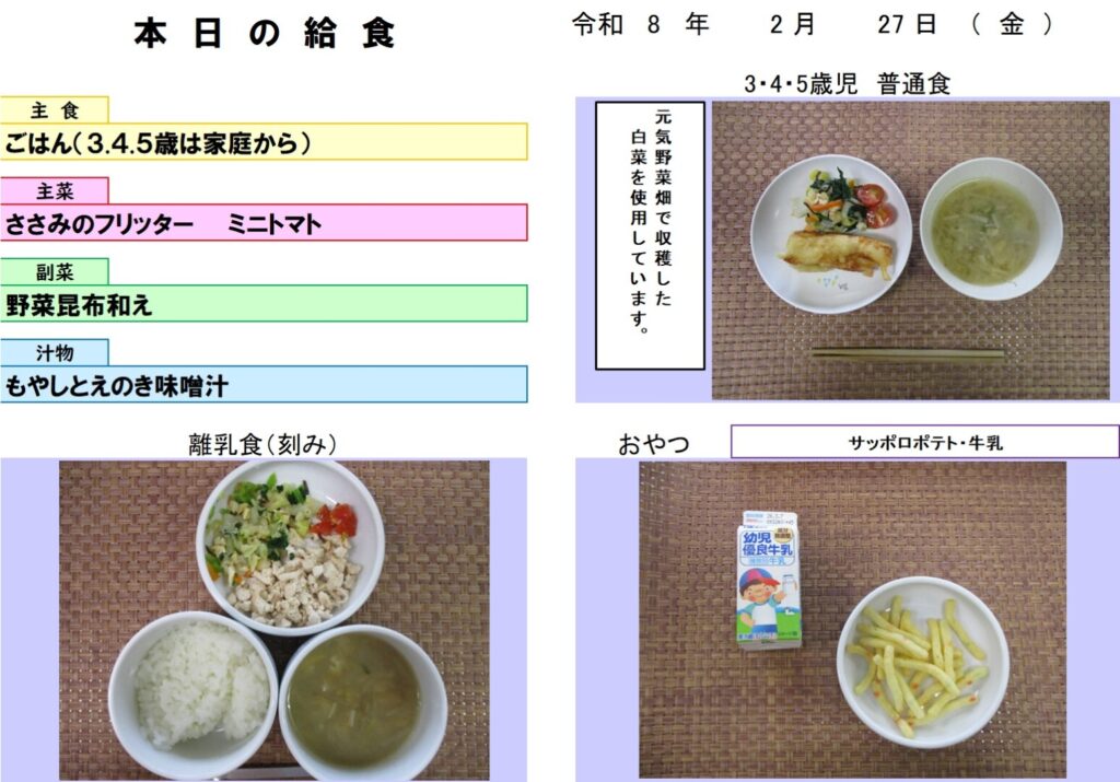 今日の給食 (R8.2.27) - 玉名市岱明町 大野保育園